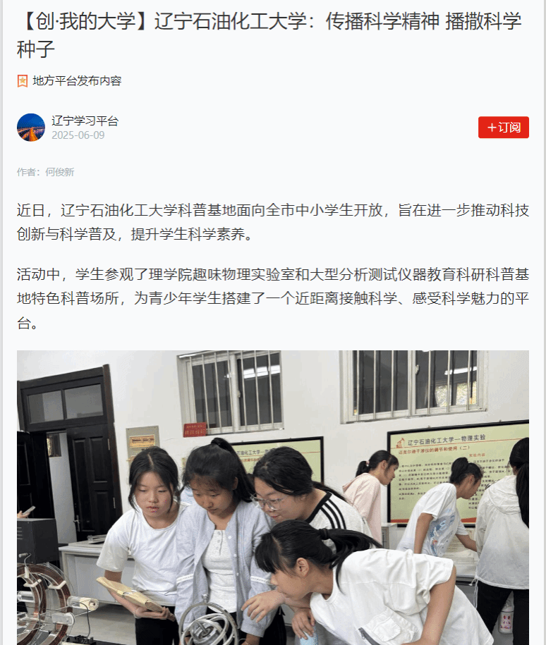编者按:近日,我校科普基地面向全市中小学生开放,旨在进一步推动科技创新与科学普及,提升学生科学素养。学习强国辽宁学习平台、教育部中国大学生在线网站、人民日报客户端·人民号、辽宁日报·辽望号、搜狐号、中国大学生网等媒体平台对此进行了宣传报道。现将相关报道转载如下: